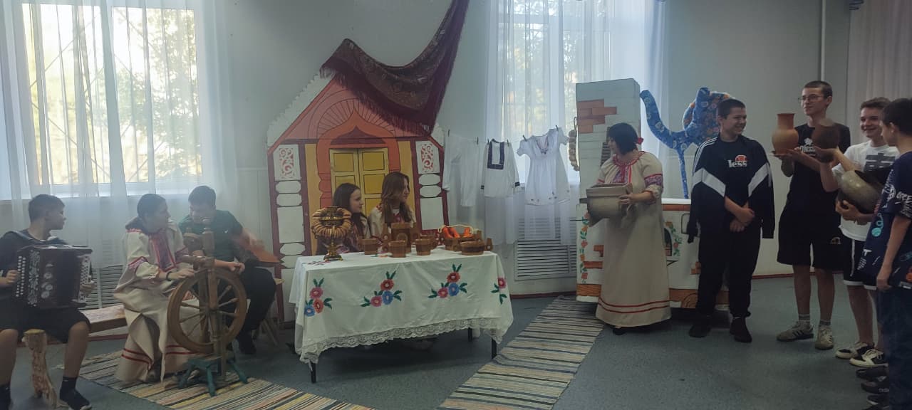 Современные дети не знают, как жили наши прабабушки и прадедушки, когда не было компьютеров, телевизоров, телефонов и прочих предметов, которыми люди пользуются сейчас. Работники культуры стараются приобщить детей к истокам русской культуры и познакомить их с предметами быта наших предков. Для детей проведена тематическая экскурсия «Русская изба» где познакомились с жизнью, бытом и традициями наших предков. Ребята с интересом рассматривали русскую печь, которая играла в доме главную роль и использовалась для отопления помещения и приготовлении пищи; орудия труда, применяемые для различных хозяйственных целей: рубель, ухват, кочерга и деревянной и чугунной посудой. Также рассказали детям про самое почетное место в крестьянской избе – красный угол, об особенностях одежды и обуви русского крестьянина.